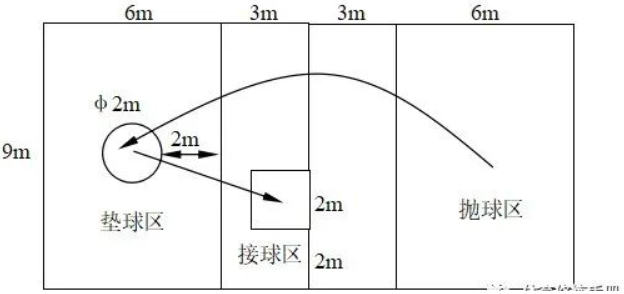 考生在后场区中央直径2米的垫球区内准备,由抛球人在对面场地进攻线后的抛球区抛球,受试者向2、3号位之间的接球区垫一传球7次(受试者的一只脚可踏出垫球区)。要求垫出的一传球要高于网口上沿,落在接球区方框内所站接球人的手上(接球人的脚可踏及接球区方框的线,但不能完全踏出)。